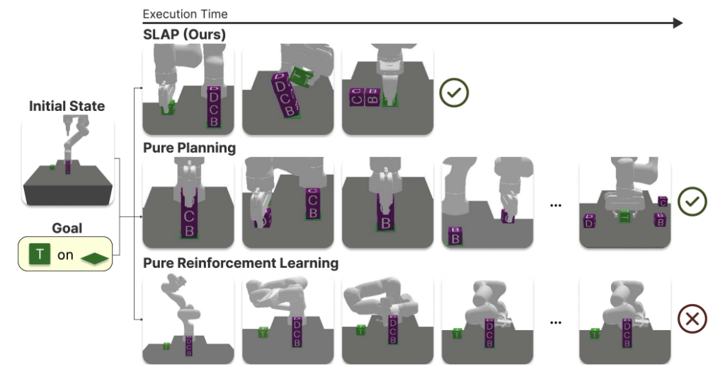 The summary below shows the agent’s summary at the end of the first episode. Its main plan for the second episode is to test for an invisible base, that might support both cubes in air. But the first episode trajectory (see video of episode 1) clearly disproves this hypothesis as cubes are placed on the ground level. Hence, the main failure mode in this case is to come up with an inconsistent hypothesis. A human on the other hand will quickly discard inconsistent hypotheses and spend time thinking about novel solutions. In this case, the solution is actually simple and something that might come naturally to humans — just stack blocks in the correct XY location and pick and hold them together at the correct target.