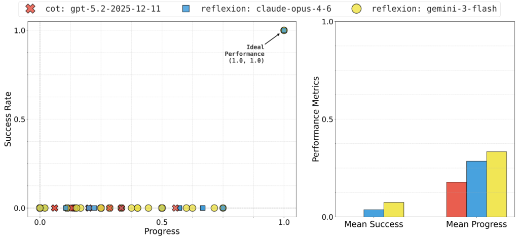 In this blog post, we will take a closer look at the results of a reflexion agent4 based on Claude Opus 4.6 (with high adaptive thinking). This agent interacts with the environment for multiple episodes and maintains a running summary of its learnings. The summaries include details of the agent’s past mistakes, learnings and best plans of action. This agent can interact with the environment for multiple episodes (three in our experiments) and use its past reflections to continually improve its decision-making. In the paper5, we have included detailed results of other models like GPT 5.2 and Gemini 3 Flash (both with high reasoning).