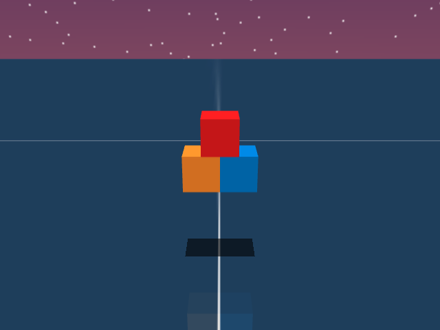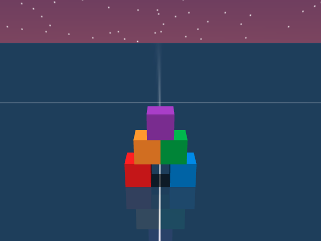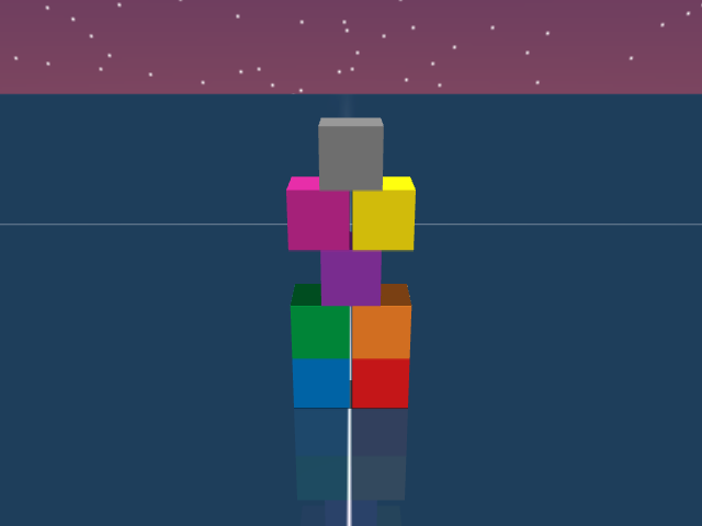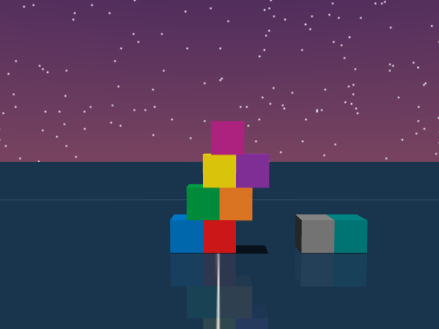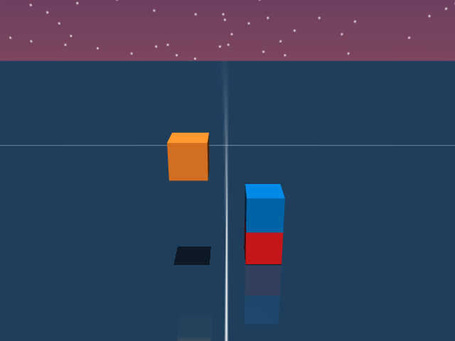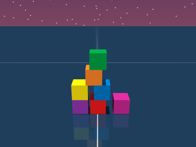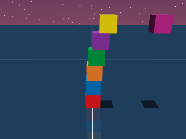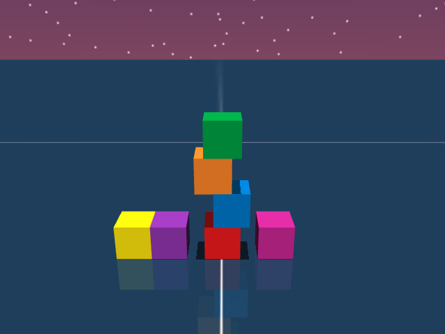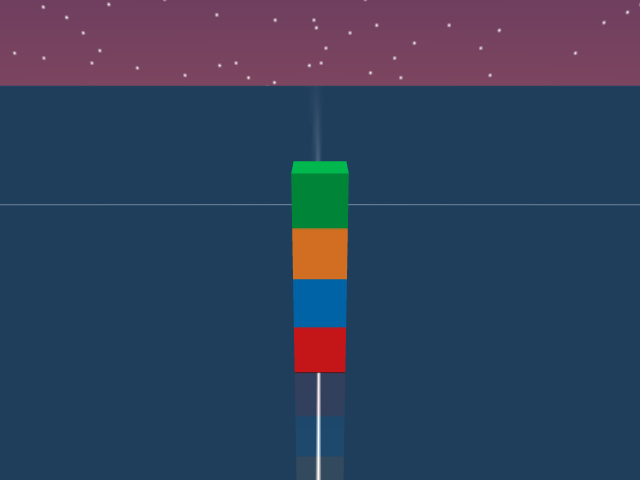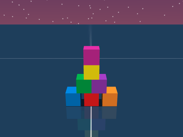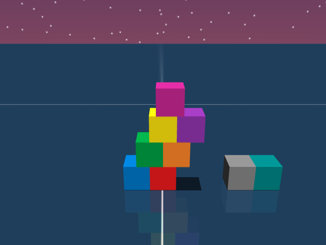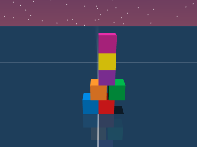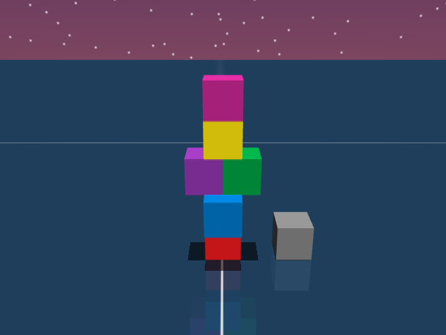 As visualized in the figure, the goal of this agent is to stack three blocks in a T-shaped block in a stable manner. The agent in this case tries to naively stack blocks, but does not realize that the naive configuration is never going to be stable. This is a particularly compelling example of a task where playful interaction might stumble on the true solution. The red block can be rotated by 45 degrees to increase the surface area of supporting both blocks simultaneously.