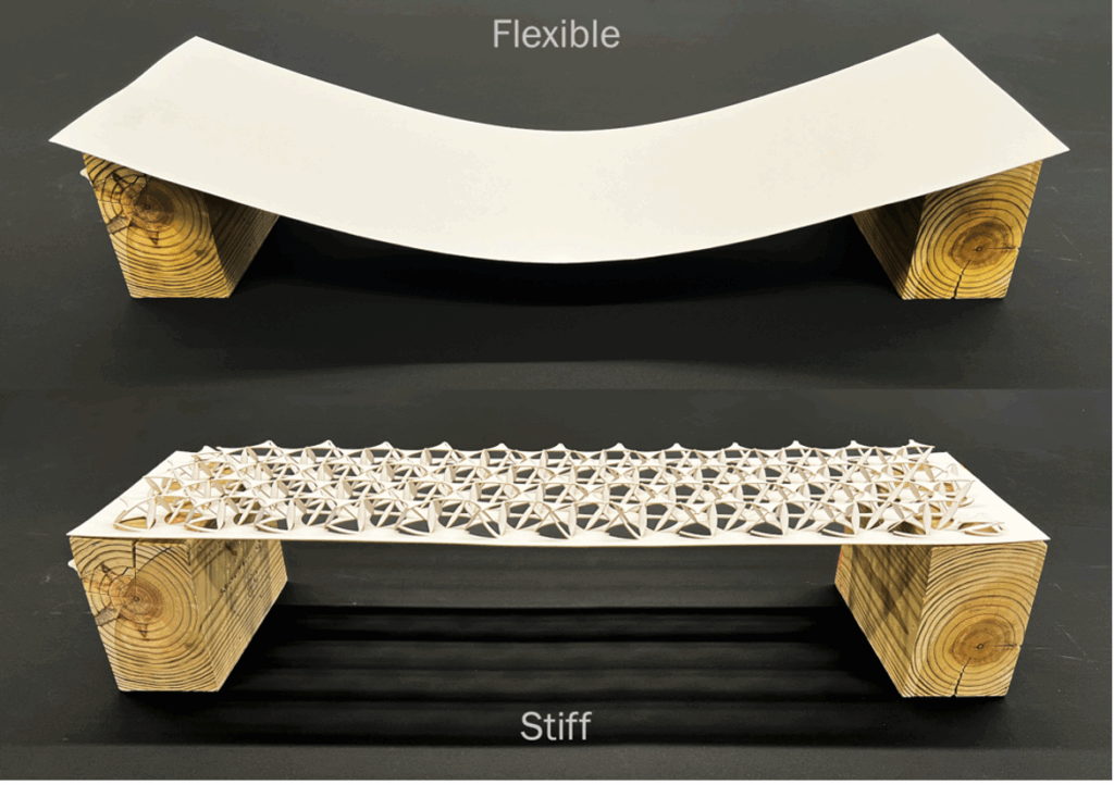 Using machine learning tools, the lab is working toward training its AI to understand the relationship between cut geometry and mechanical output. Feed it a dataset of simulations: stretch a pattern, twist it, compress it, record how it responds. Over time, the AI learns to predict behavior without running the full physics each time. But more excitingly, it learns to design backward – to start from a desired behavior, say, “withstand 50 kg (110 lbs.) of concentrated load over a 4-meter span,” and output the geometry that can make that behavior real.